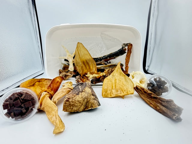 Elke Kluifkist bevat een selectie natuurlijke, luchtgedroogde snacks zonder toevoegingen: 4x Inktviskauwplaat 10x Sprotjes 1x Ganzennek 1x Eendennek 2x Paardenslokdarm 5x Runderlong 2x Konijnenoren 2x Lamsoren 2x Gepofte kippenpoten 1x Varkensoor 3x Pensstaafjes 5x Runderspaghetti 2x Runderoor zonder pit 2x Zalmhuid 1x Gepofte varkensneus 1x bakje filet trainers 1x gedroogde vleesblokjes